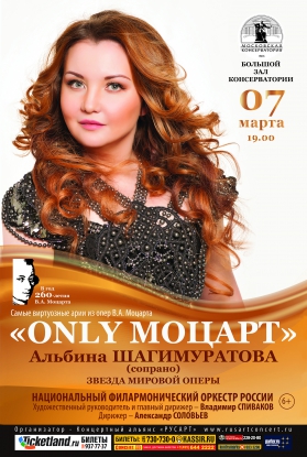 Лучший подарок в преддверии 8 марта это, безусловно, музыка Моцарта в исполнении примадонны мировой оперы – Альбины Шагимуратовой и одного из ведущих мировых симфонических оркестров – Национального филармонического оркестра России!